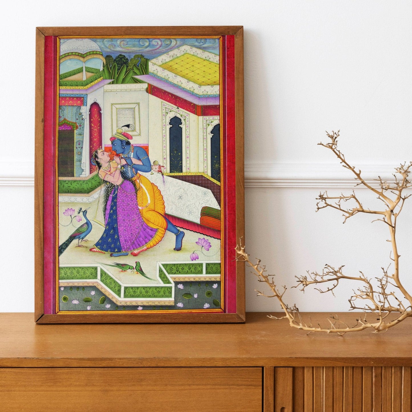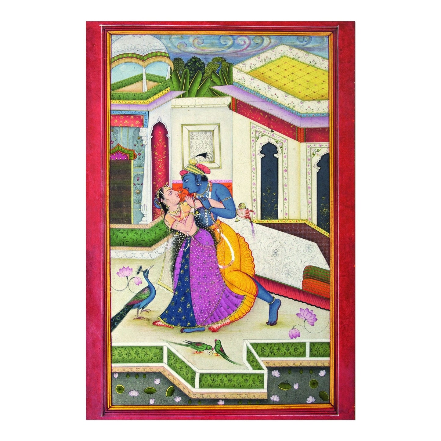 Ein traditionelles indisch-hinduistisches Gemälde mit dem Titel „Krishna und Radha“, erhältlich als hochauflösender Giclée-Druck in verschiedenen maßgeschneiderten Größen.