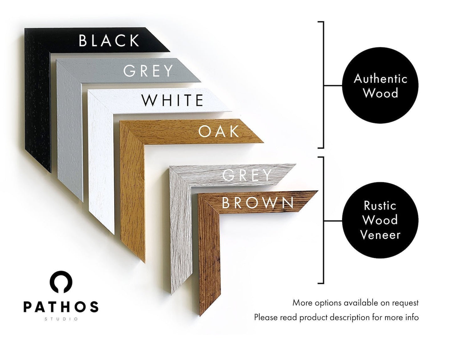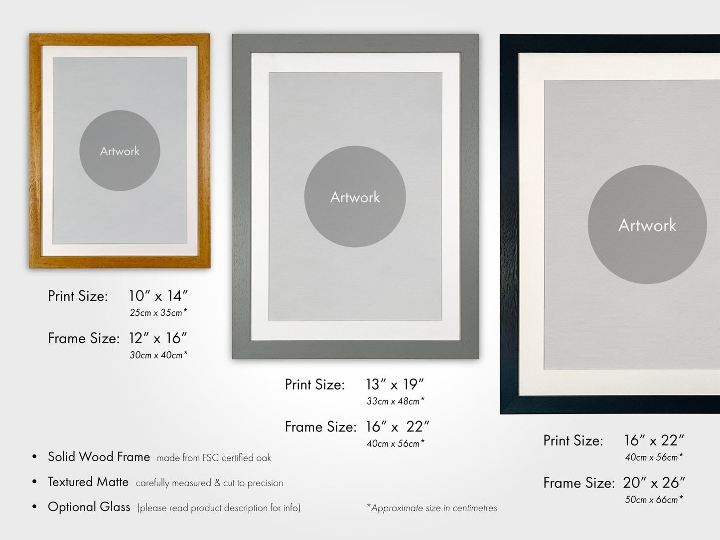 Drucke können auch in maßgeschneiderten Holzrahmen mit strukturiertem, mattem Rand und authentischem Glasfenster bestellt werden. Sie sind in einer Vielzahl von Ausführungen in den folgenden Größen erhältlich: