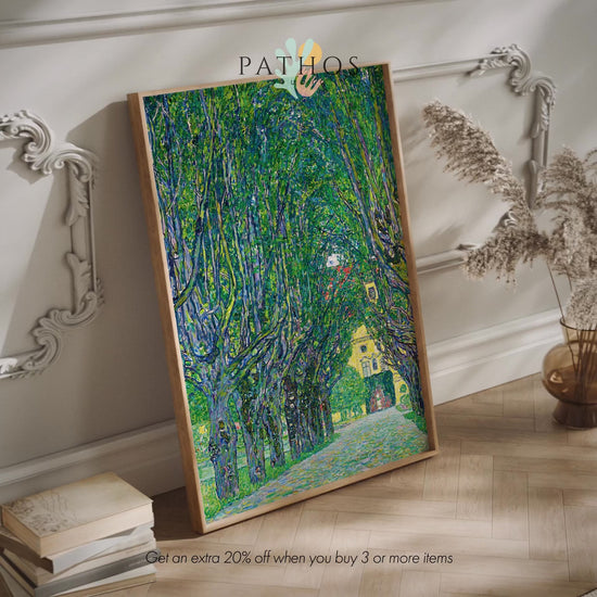 La peinture classique à l'huile sur toile de Gustav Klimt intitulée "Allee at Schloss Kammer", disponible sur commande en tant qu'impression d'art giclée haut de gamme avec une large gamme d'options de cadrage.