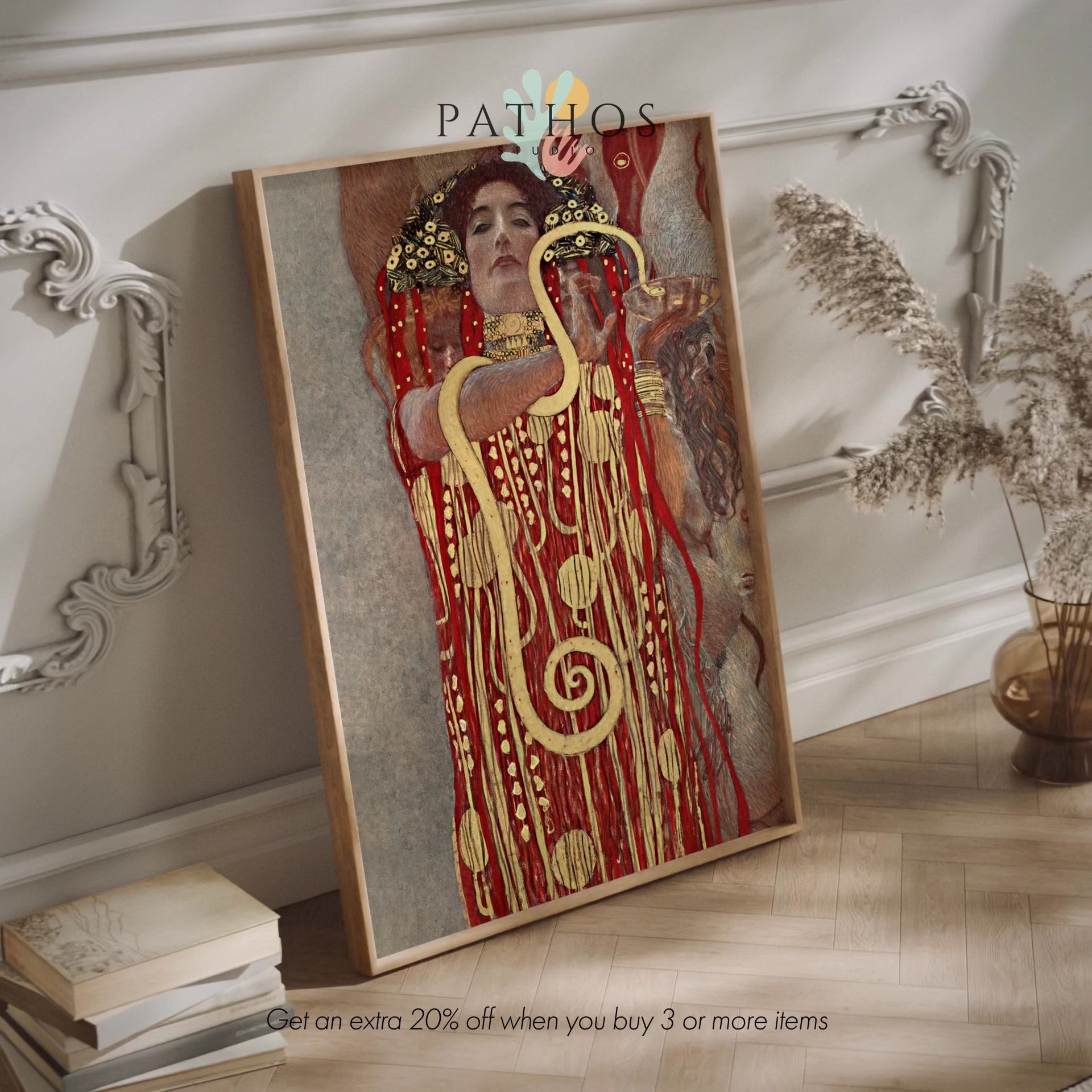 La peinture classique à l'huile sur toile de Gustav Klimt intitulée "Hygieia", disponible sur commande en tant qu'impression d'art giclée premium avec une large gamme d'options de cadrage.