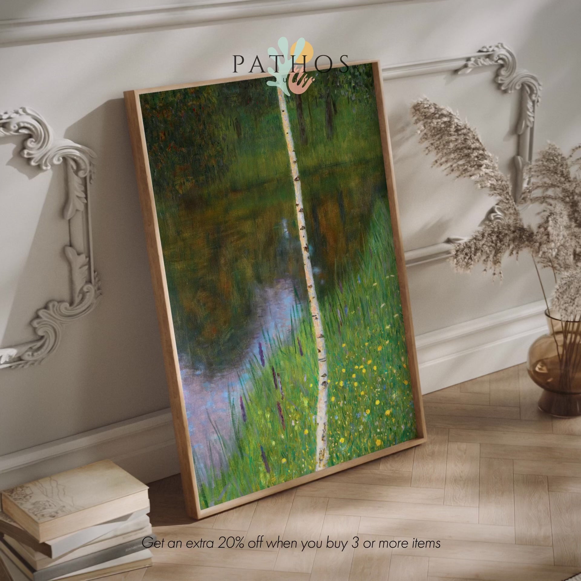 Les peintures classiques à l'huile sur toile de Gustav Klimt intitulées « Lakeshore With Birches », disponibles sous forme d'impression giclée haut de gamme et avec une variété d'options d'encadrement.