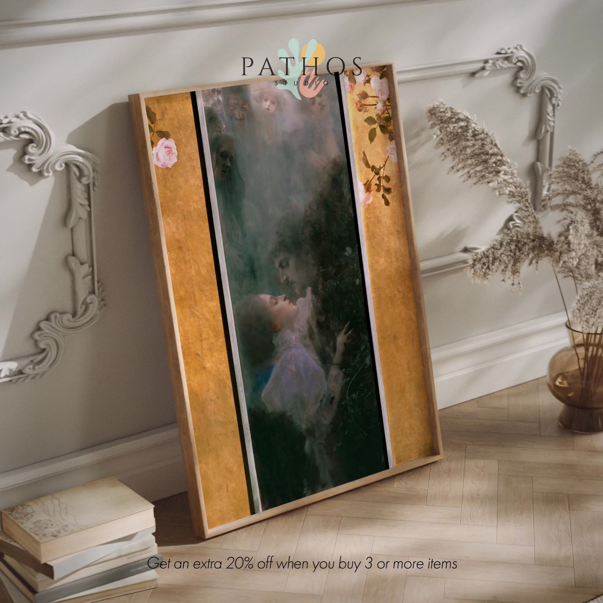 La peinture classique à l'huile sur toile de Gustav Klimt intitulée "Liebe", disponible sur commande en tant qu'impression d'art giclée premium avec une large gamme d'options de cadrage.