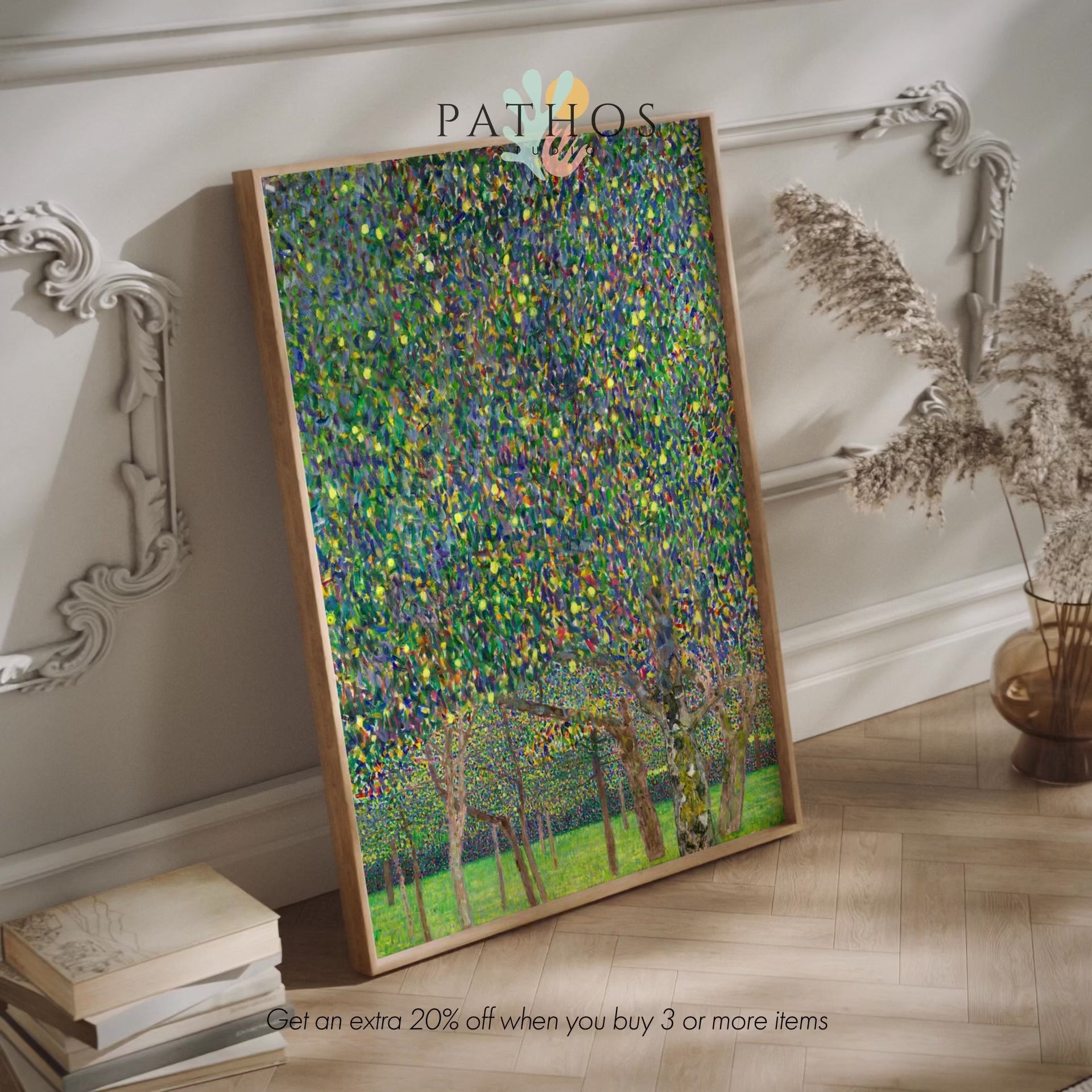La peinture classique à l'huile sur toile de Gustav Klimt intitulée "Pear Tree", disponible sur commande en tant qu'impression d'art giclée premium avec une large gamme d'options de cadrage.