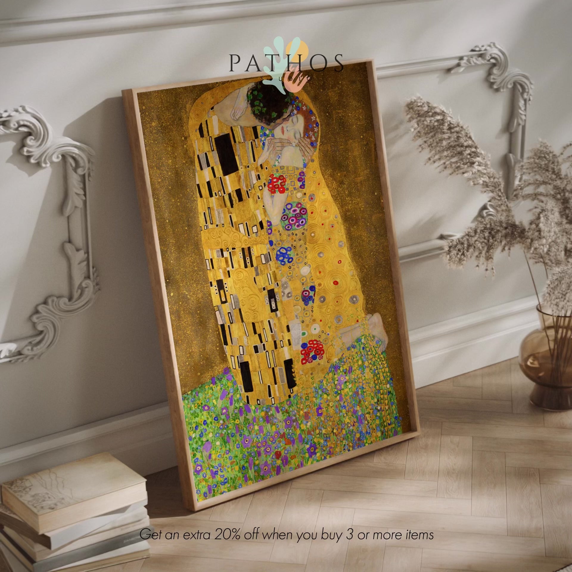 L'une des peintures à l'huile sur toile classiques les plus célèbres de Gustav Klimt intitulée "Le baiser", disponible sur commande en tant qu'impression d'art giclée premium avec une large gamme d'options de cadrage.