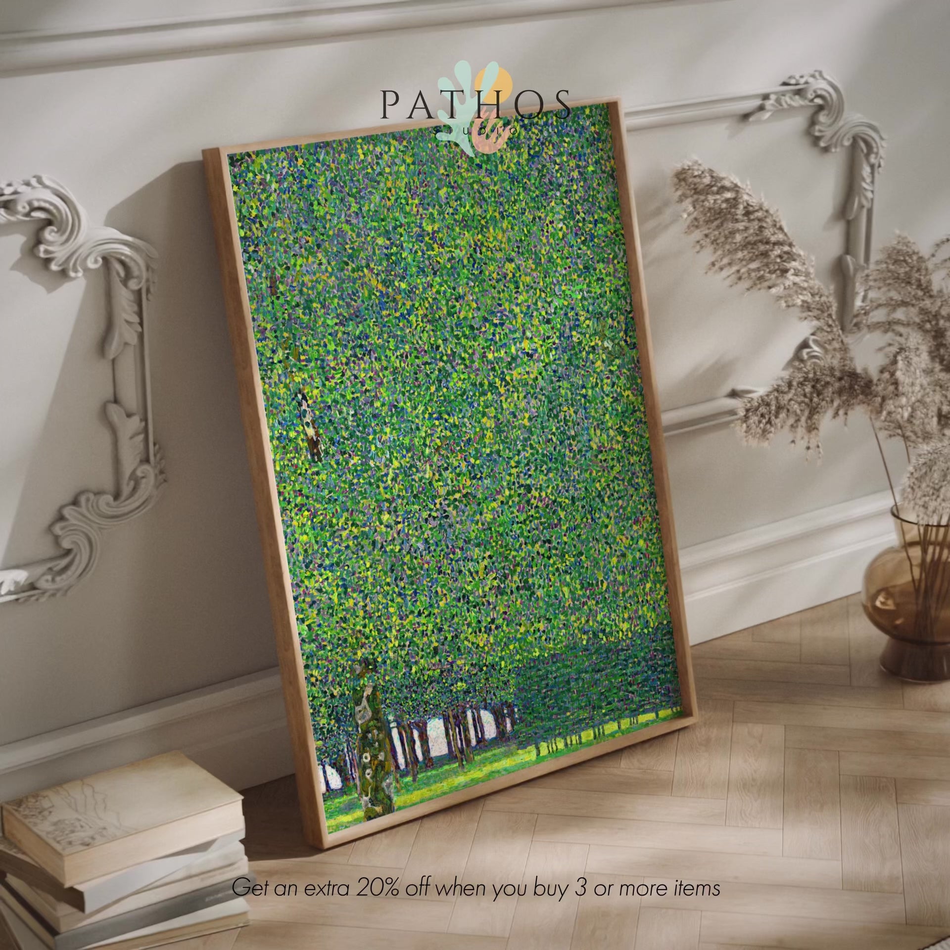 La peinture classique à l'huile sur toile de Gustav Klimt intitulée "Le parc", disponible sur commande en tant qu'impression d'art giclée premium avec une large gamme d'options de cadrage.