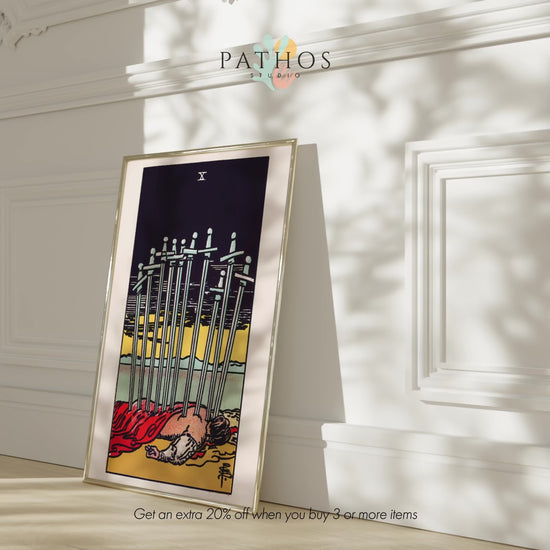 'Ten of Swords' is a Minor Arcana tarot card illustrated by Pamela Colman Smith (Pam C) in 1909, available here as a premium giclée print with a selection of framing options.