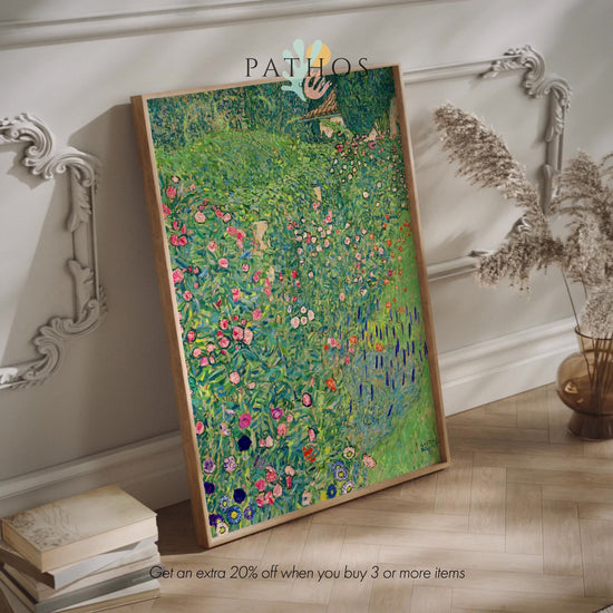 Painted in 1913, during Klimt’s travels in Italy, the work is celebrated for its lush depiction of a terraced garden, with sunlit foliage and a rich tapestry of colour. Its intricate surface pattern and vibrant natural forms exemplify Klimt’s mature landscape style, blending realism with his signature ornamental vision.