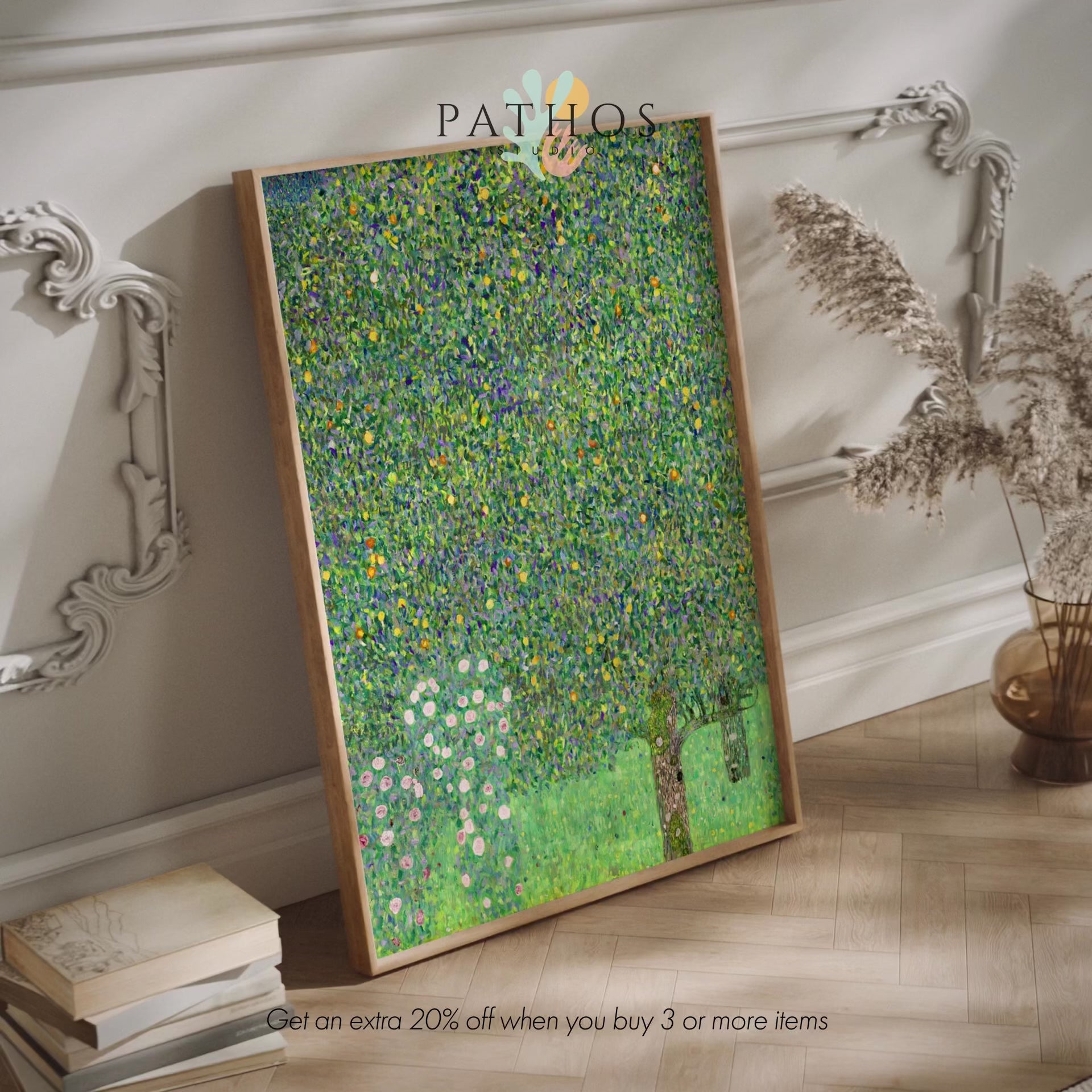 Gustav Klimt's classic oil-on-canvas painting titled 'Rosebushes Under The Trees', available to order as a premium giclée art print with a wide range of framing options.